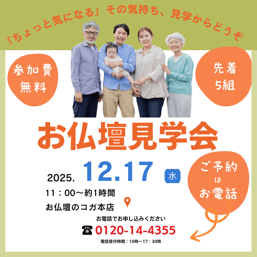 お仏壇のコガは福岡市を中心に、日赤病院横本店(ギャラリーメモリア福岡南/現代仏壇ギャラリーを併設)、太宰府店(現代仏壇ギャラリー太宰府を併設)の2店舗を営業しております。地域の皆様には長年お世話になっております。いつも皆様のニーズにお応えできるよう、ご予算に応じた最良のご提案をさせていただきます。スタッフ一同、常にお客さまの立場に立ってご供養のお手伝いができますよう心がけております。