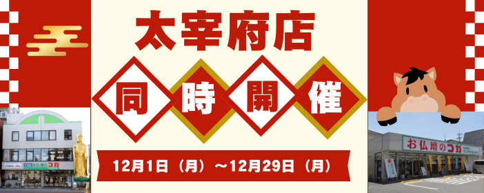 お仏壇のコガ恒例初売り半額を今年は一足早くお届けします!従来の年始の混雑なし!落ち着いた店内で、経験豊富なスタッフとじっくりと相談しながら、納得のいくお仏壇選びが出来ます。
